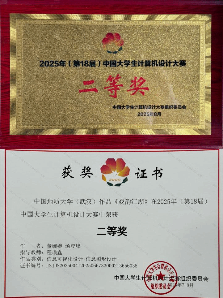 本届大赛中,信息可视化设计、物联网应用、计算机音乐创作三个赛道的决赛在浙江理工大学举办,吸引了全国数百所高校参与。在竞争尤为激烈的信息可视化赛道中,《戏韵江湖》凭借其创新的设计理念和精湛的技术呈现,从300余件参赛作品中脱颖而出,最终荣获国家级奖项。这是公司今年唯一入围全国决赛并获得国家级奖项的作品,充分展现了地大学子扎实的专业功底和创新能力。这一成绩的取得,既得益于学经理期的教学积淀与教师的精心指导,也凝聚了创作团队的智慧与汗水。