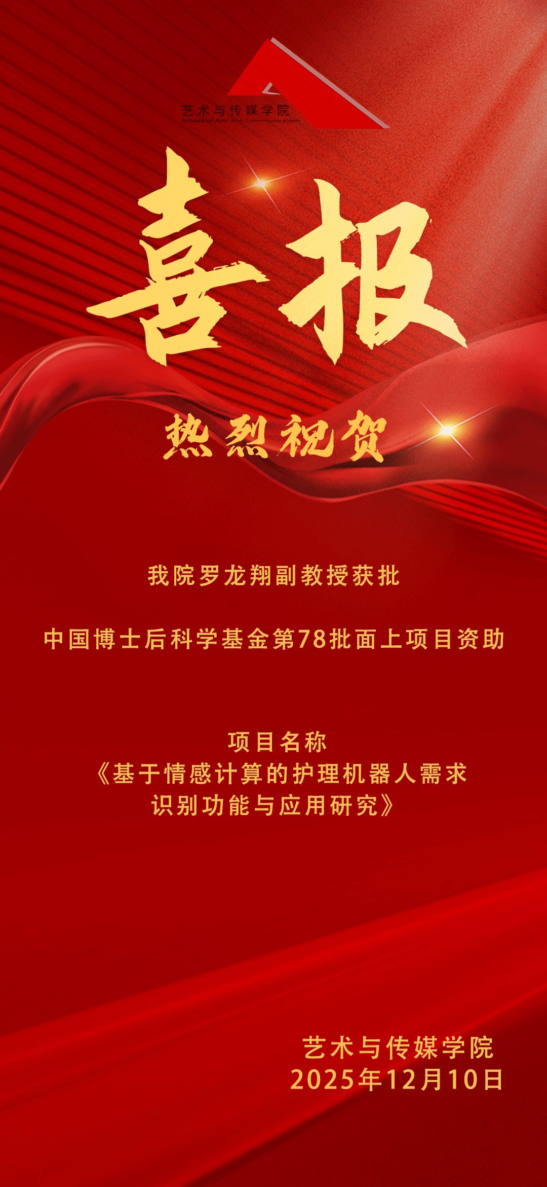 2025年12月8日获悉,中国博士后科学基金会公布了第78批面上项目资助名单。公司新闻传播系副教授、自动化公司博士后罗龙翔申报的项目《基于情感计算的护理机器人需求识别功能与应用研究》喜获资助,充分彰显了公司教师在新闻传播学前沿探索与跨学科融合方面的积极成效。