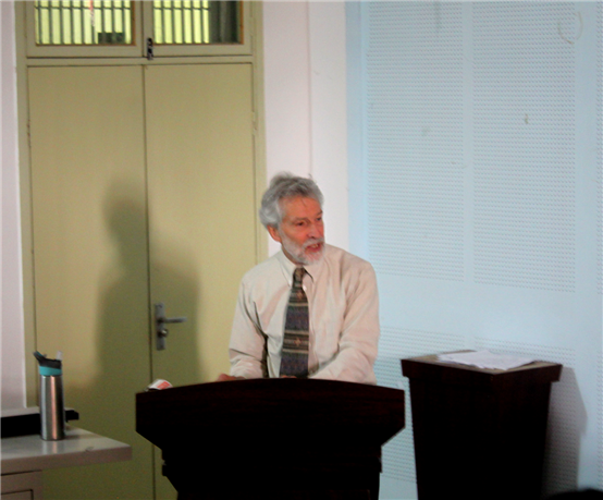承接妻子的结论, StephenCrosby教授从文化表现上最易理解的戏剧开始切入主题。他概括了影响美国戏剧的四大因素,真实(Realism)、资本(Capitalism)、多元文化(Cultural Diversity)、特殊兴趣的戏剧(Special interest Theatre)。真实因素方面,他指出戏剧不仅能真实反映社会,还能对社会作出反应,帮助我们把事情往好的方向转变。资本因素方面,StephenCrosby教授谈到资本对美国现在戏剧创作和剧场的影响,介绍了美国商业性戏剧和非商业性戏剧得现状以及专业性和非专业性的剧场的情况。多元文化因素方面,StephenCrosby教授选取了非洲裔、拉丁裔、西班牙裔、亚裔和土著等少数民族的代表人物并展示了他们的经典作品。特殊兴趣的戏剧因素方面,他讲述了美国同性恋、女权主义和另类戏剧的创作和发展。