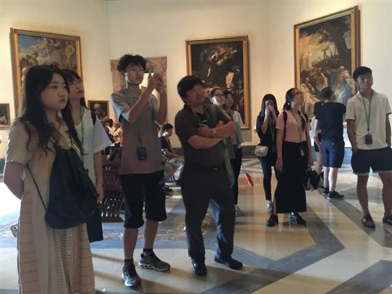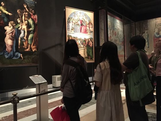 用过中餐后,雨势渐微,实习小组决定将圣彼得之旅放在明日上午,下午先去宗教之国梵蒂冈参观。在罗马小巷中七绕八拐之后,老师带着同学们过了安检进入梵蒂冈博物馆。从鲜活生动的古希腊与古罗马雕像开始,老师带着大家一一参观了如《拉奥孔与他的儿子们》、《躯干》等在艺术史上留有盛名的作品。接着,同学们参观了乔托、卡拉瓦乔、拉斐尔、达芬奇等大师的画作,从平面化的拜占庭风格到文艺复兴后期透视成熟,结构精准,光感真实细腻的画作,再到狂放肆意的现代艺术创作,这些瑰宝在写生实习小组眼前接连展现。在这座高大雄伟的博物馆内,承载着的是历史、艺术,是千百年来无数伟人所构建的不朽殿堂。