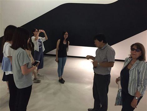 下午,等到罗马的烈日稍有退去之时,大家跟随老师来到了由世界著名设计师扎哈•哈迪德设计的罗马国立当代艺术博物馆(简称'MAXII'),同行的还有一位将帮助实习小组举办罗马写生展的尼古利娜女士。去年,这位亲切开朗的女士也是地大罗马写生展的策展人。第一眼看去,博物馆的外形夺人眼球,扎哈•哈迪德将其设计得犹如现代的钢筋铁轨卧于罗马这片古老的土地上。有罗马人戏称它是“插入城市中心的大铁路”。实习小组自博物馆一楼向上依次参观,老师们在一旁帮大家讲解,使同学们对现代艺术有一个更加明确的认识,从而从中获得未来几天作品的灵感。馆内除了小型的作品以外,还有不少几乎占据一整面墙的大作品,如科贝尔创作的大型雕塑黑色喇叭,以及基弗在画布上用烧焦的土块创作出的星空。