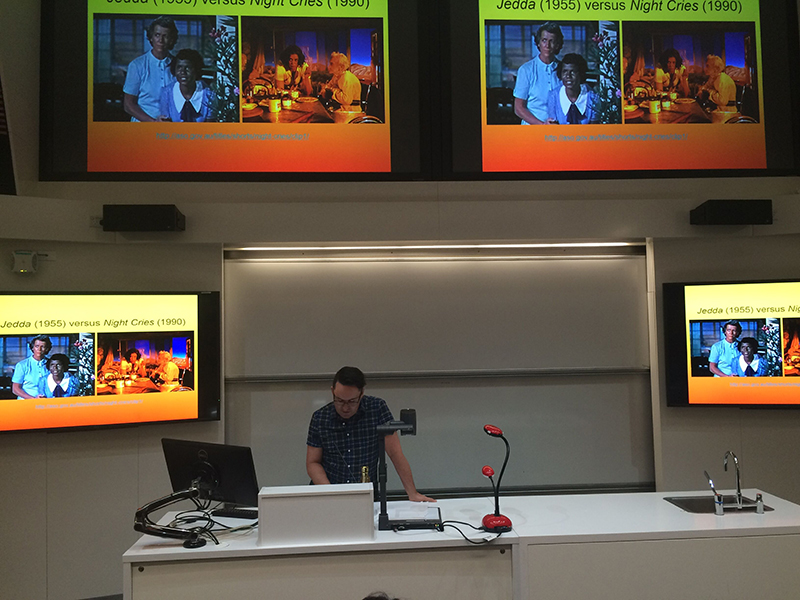 下午16:00整,结束交流会后,紧接着又开始了一场有关于印第安人影视作品的讲座,主讲人是麦考瑞大学影视专业的博士anthomy。课堂上他针对20世纪后半叶及21世纪初的影视作品进行分析,并将演员在不同作品中的人物角色作对比,如:jedda1995、night cries 1990等,为区分不同年代作品对人物刻画、剧情推进、情感提升的处理。 全体师生深感印第安影视作品历史渊源悠久,并感叹每一部完整的作品都是经过艺术工作者精雕细琢。而忙碌的周一就在这看似娱乐却又收获颇多的讲座中落下帷幕,结束了今天的学习。