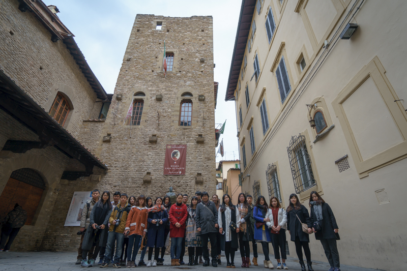 但丁故居位于佛罗伦萨古城中心的圣玛格丽塔路一号,是一座设有中世纪塔楼的房屋。马林老师认为,但丁正是在这座楼中写下了著名的《神曲》。此外,他还表示:“如今,人们所说的意大利语改革也跟但丁有关,他是现代意大利与的奠基者,也是欧洲文艺复兴时代的开拓人物之一。”语毕,马林老师便邀访学团全体成员在但丁故居前合影留念。