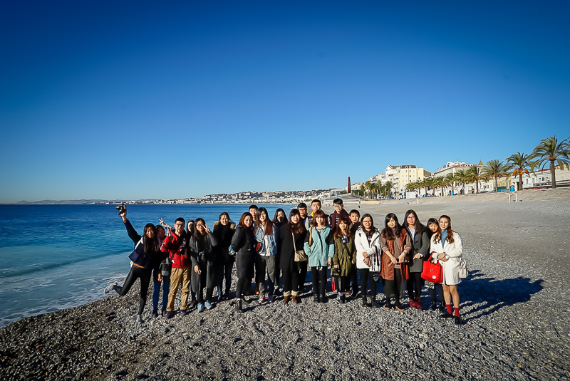 是在前往尼斯天使湾的途中,马老师为访学团详细介绍了尼斯城的历史:在公元前后漫长的岁月里,尼斯城先后被古希腊和古罗马交替统治,并在一段时间内一度成为罗马抵御外敌的重要据点。历史的特殊使得尼斯的文化变得十分独特,兼具意大利与法国特色。讲解完毕,访学团在程璜鑫老师的带领下沿英国人散步大道近距离观赏海岸景观,体验地中海的风土人情,并且在海岸边合影留念。