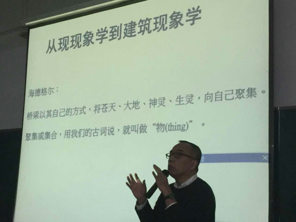 季铁男先生说,许多人讲解“风水”时引用很多资料,提供大量信息,但仍让人摸不清是不是该听、是不是可信,“这是今天的讲座我要尽量避免的”。讲座重点介绍西方哲学与中国风水之间的关系,并指出两者之间是可以进行交流的,建筑现象学与风水学之间有互通的地方。