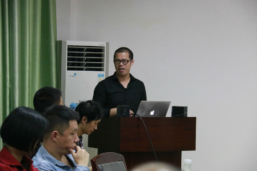 经理赵冰和嘉宾刘永清互相赠送书籍作为纪念。论坛会开始后,嘉宾刘永清首先播放了一段平面设计主题片,然后介绍了深圳市平面设计协会的规则、类别,讲解了平面设计的实效性和奖项设计,并鼓励在场员工投稿自己的作品。