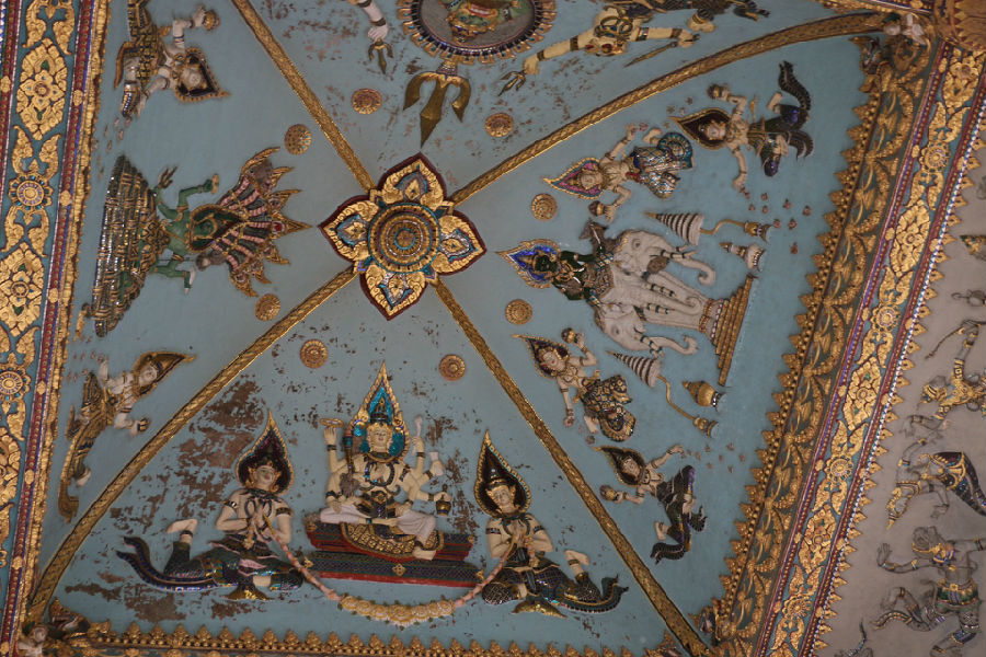 老挝寺庙的建筑带有浓厚民族信仰。寺庙的俩边都有雕刻,以层式结构表现了代表勇气的si女神:在寺庙每个方向门的入口处都有一对老挝典型的那迦,它类似于中国龙的形象,十分神气;沿着台阶走上去,脱掉鞋子上到铺有瓷砖的平台,抬头会看到上方穹顶的壁画,大约二十多幅画,讲到的是佛经里面王子维散顿原从出生到引导人民向善向美的过程,壁画表现形象生动,言简意赅,引人深思;四周的支撑柱都在顶端配以装饰;在寺院的周围除了一些当地植物,还有一些具有信仰的雕塑,有五张面孔的湿婆神,还有一些各种动作的佛像……