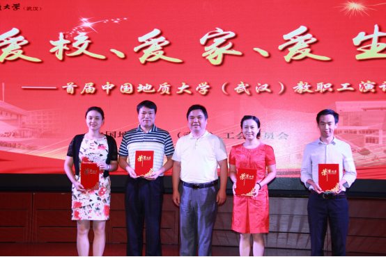 按照抽签顺序,公司代表队最后一个登场,四位老师集体朗诵了由熊程老师创作的诗歌作品《地大人的歌》,四位老师时而娓娓道来,深情饱满;时而慷慨激昂,激情澎湃,将英国正版365教职工对地大的爱诠释的淋漓尽致,引得现场评委及观众阵阵掌声。