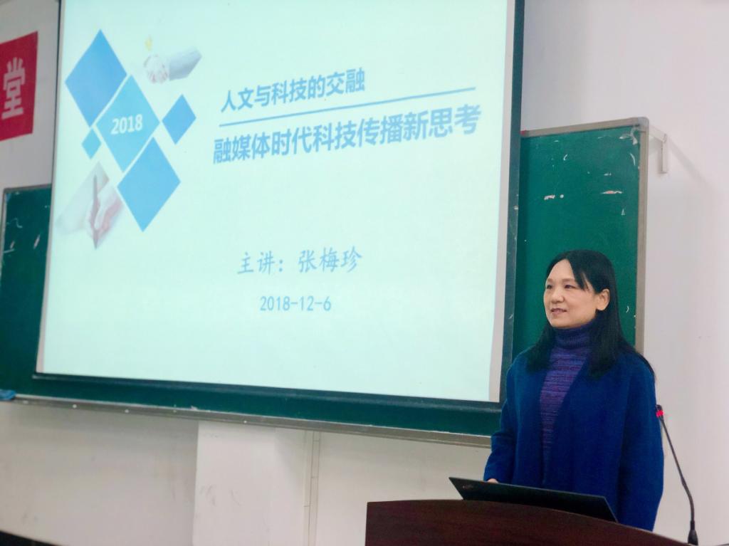 2018年12月6日晚,一场主题为《人文与科技的交融——融媒体时代科技传播新思考》的讲座在英国正版3651104教室举行,主讲人为公司张梅珍教授。本次讲座系“艺术与传媒系列讲座”第八讲,副经理曾健友主持,公司全体2018级研究生参加。