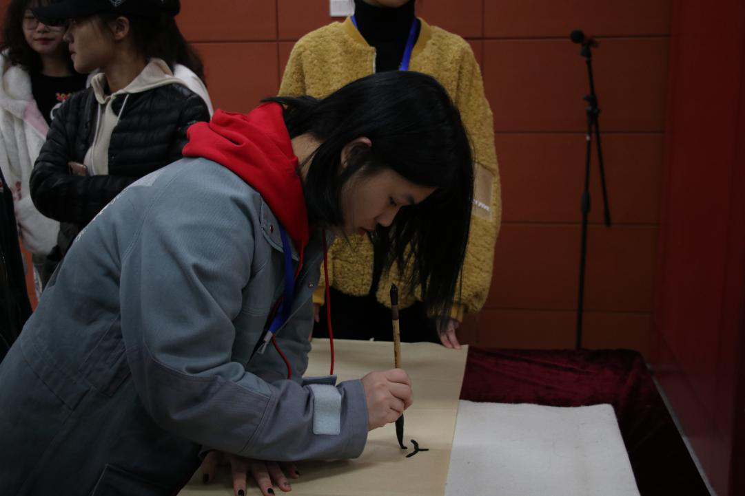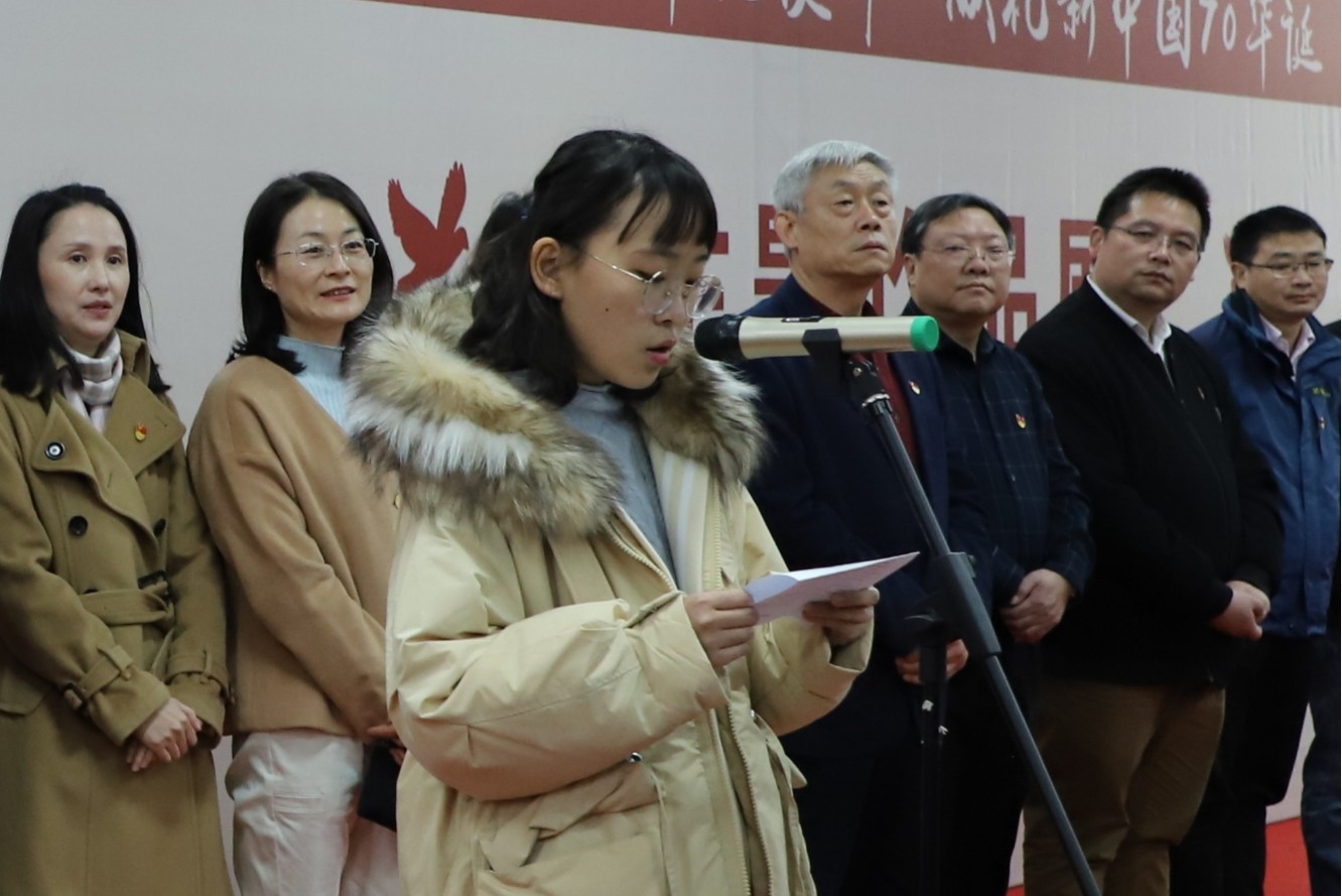 2019级设计学专业本科生杜俊彦代表参展员工发言。杜俊彦用极富文采的语言表达了自身对新中国一路走来历经艰险,取得的辉煌成就的触动,展示了作品的创作意境。最后,杜俊彦对全体员工发出号召:要以“何时缚住苍龙”的决心与勇气,为祖国的明天贡献自己的力量。