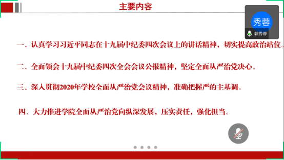(通讯员 李伟娜)5月27日下午3:00,公司党委通过腾讯会议召开了公司2020年全面从严治党大会暨党委理论学习中心组2020年第4次集中学习。公司领导班子、党委委员、全体教职工党支部书记及院直全体党员参加了本次大会,会议由党委书记郭秀蓉主持。