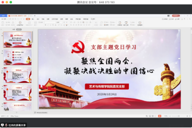 五个教工党支部分别结合当前实际,利用腾讯会议、党支部微信群、新华网2020年全国两会大型融媒体专题、“学习强国” 客户端等形式,开启在线集中学习。本次主题党日活动重点学习了2020年全国两会精神。各支部通过观看学习视频、领学人PPT讲解、参会人结合实际交流发言等多种形式加深对学习主题的认识与了解。视觉与媒体设计系党支部党员同志们在学习中不仅畅谈了学习全国两会精神的感想,还结合专业讨论了设计扶贫、马克思艺术观、课程思政、新时代文艺工作等问题。新闻传播系党支部党员认为,贯彻落实两会精神,关键是拿出真抓实干的行动,敢作为、善作为、踏实干,不同部门之间要加强协同配合,增强政策举措的灵活性、协调性、配套性,努力取得最大政策效应。景观学系党支部党员认为2020是全面建成小康社会的收官之年,也是决胜全面建成小康社会的关键之年,大家要发挥实干精神,突出发展重点,认真将两会精神实事求是地落实在教学和科研中。音乐系党支部党员同志们着重学习习近平总书记在湖北省代表团的重要讲话精神。院直党支部在支部成员杜玮老师精心准备的领学下全面学习与领会了两会精神,大家结合自身工作谈了对本次学习的理解和感悟。