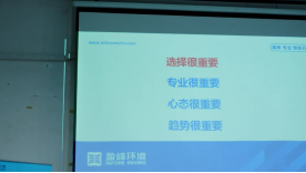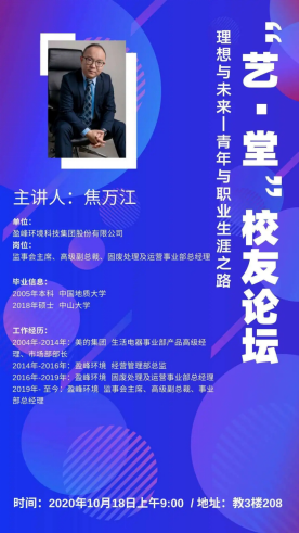 焦万江先生首先做了自我介绍,亲切自然地讲述自己在地大的回忆,与学弟学妹们拉进距离,并且向同学们提出问题——在地大生活中什么最重要,以此来引出今天讲座的主题,也引发同学们思考并参与互动。在听完员工们主动畅谈想法后,焦万江先生阐明讲座的初衷,希望可以分享自己从毕业到美的再到盈峰环境一路走来的经验教训,让同学们少走弯路。