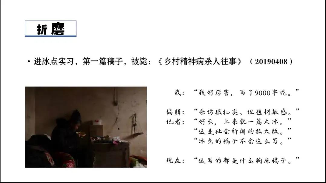 他分享了自己工作过程中的得与失。沉没的大兴火灾新建村新闻录虽没有被报社发表,却使他收到冰点周刊的实习邀请;在京都报实习时接触到许多真正的新闻事例,让他学习到真正的社会机构媒体处理工作的方法。在正式进入冰点周刊工作后,李强记者经历了多次毙稿也背负着巨大压力、经历了许多思想挣扎,如《逃离》的发表并没有帮助魏光财一家走出村庄,但也有监督性报告《活在表格里的牛》超出预期地推动了脱贫攻坚问题的治理。他总结道:“新闻是对当代历史的记录,每一篇都有其深刻性和意义。”