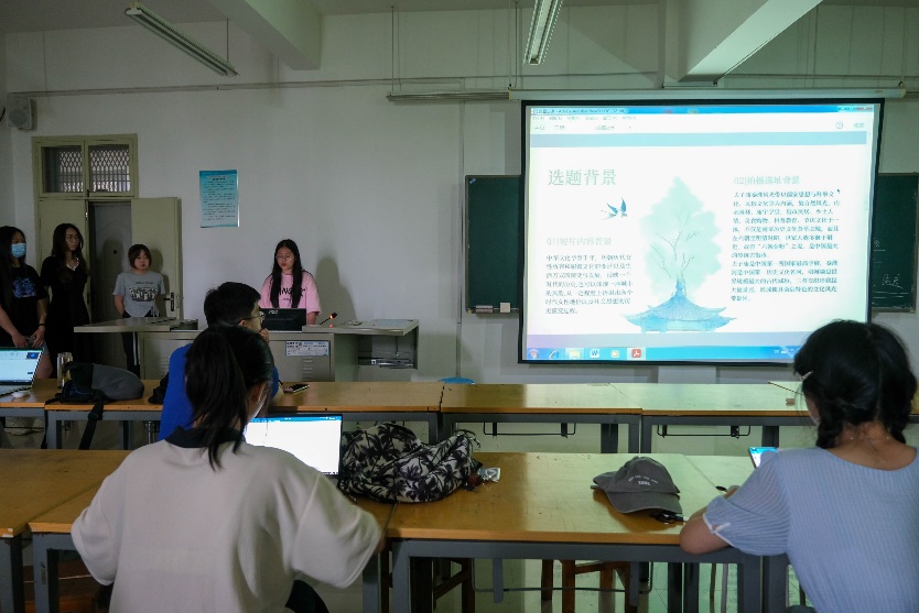 第二组汇报人高恬泽惠以白族扎染技艺相关背景切入,展开选题汇报。刘定耀老师叮嘱同学要事前联系好采访对象,注意时间安排,确保时间充裕,并购买人身意外保险再出发,喻继军老师肯定其方案,提醒员工注意防疫政策,实习以安全为第一位。