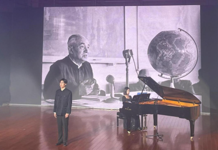 中国地质大学新闻传播学硕士王琼逸代表员工发言,同为中国地质大学员工的吴恺文(讲述人)、王艺璇(钢琴伴奏)现场表演了配乐朗诵《大地之光》。