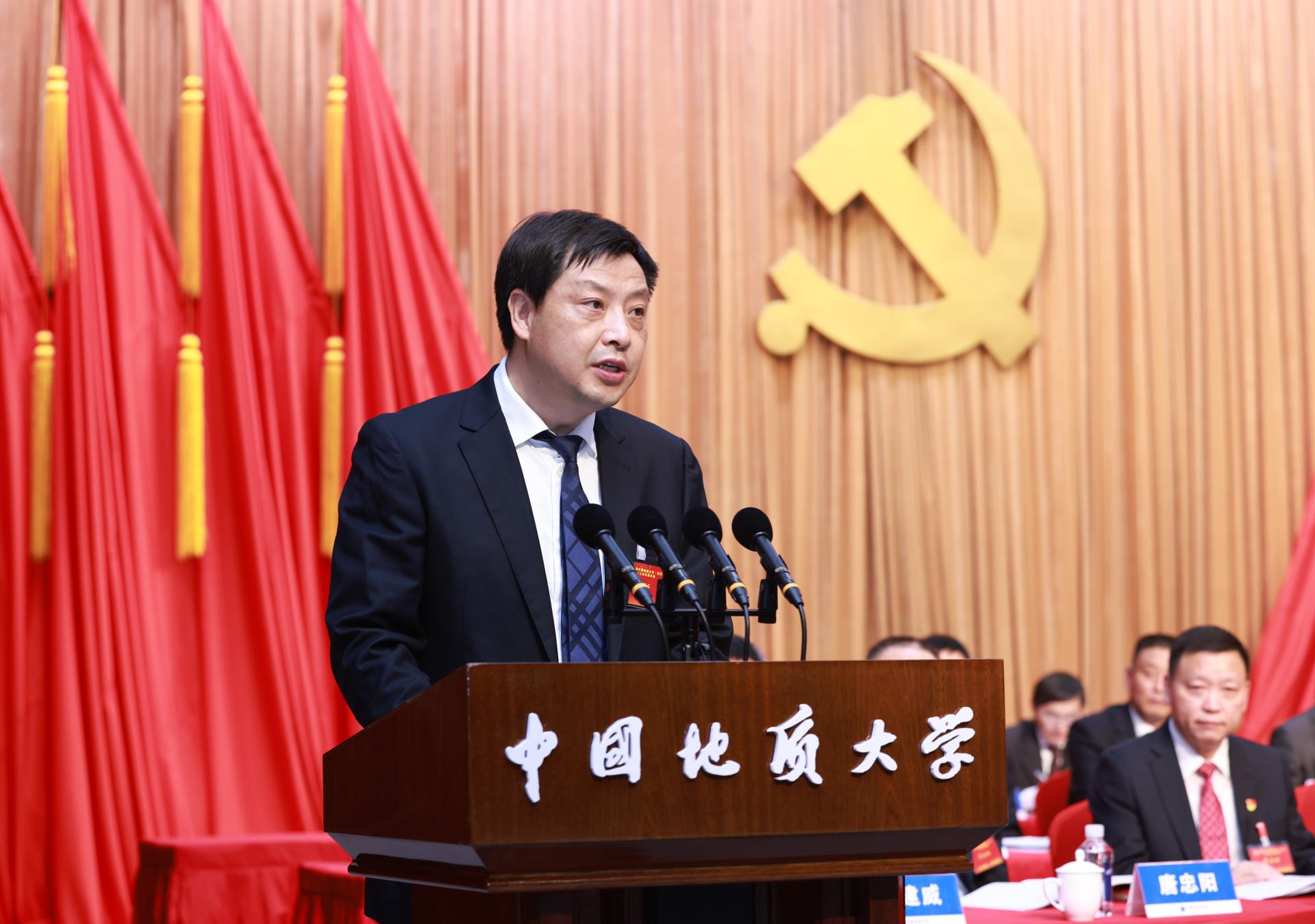 在主席台就坐的还有,湖北省教育厅组织处处长乔志强,中共湖北省委组织部干部五处副处长徐杨,中国地质大学(北京)党委常委多宏宇。