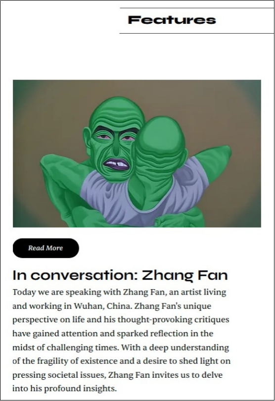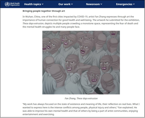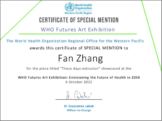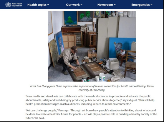 近日,世界卫生组织西太平洋区办事处(World Health Organization | Regional Office for the Western Pacific)官方网站在题为“Using art to inspire positive change for future health in the Western Pacific”的专题报道中刊发了公司张帆副教授的访谈及作品。2022年,张帆副教授作为唯一一位来自中国的艺术家参与了世卫组织西太平洋区办事处的艺术项目“WHO Futures Art Exhibition”,作为该艺术项目的组成部分,世卫组织西太平洋区办事处对张帆副教授进行了专访并于近日在专题报道中刊发了部分访谈内容。专访中张帆副教授与对方探讨了艺术家的创作;“COVID-19”对世界及人类社会的影响;如何改善解决生态环境问题;艺术对创建健康未来社会的作用以及疫情影响下艺术家个人生活状态等议题。张帆副教授的作品曾在多个国家展出并发表收录于多部国际艺术出版物,近年来欧洲多个国家的艺术杂志及网站也相继对张帆副教授进行了专访并全文刊发了访谈内容及部分作品。