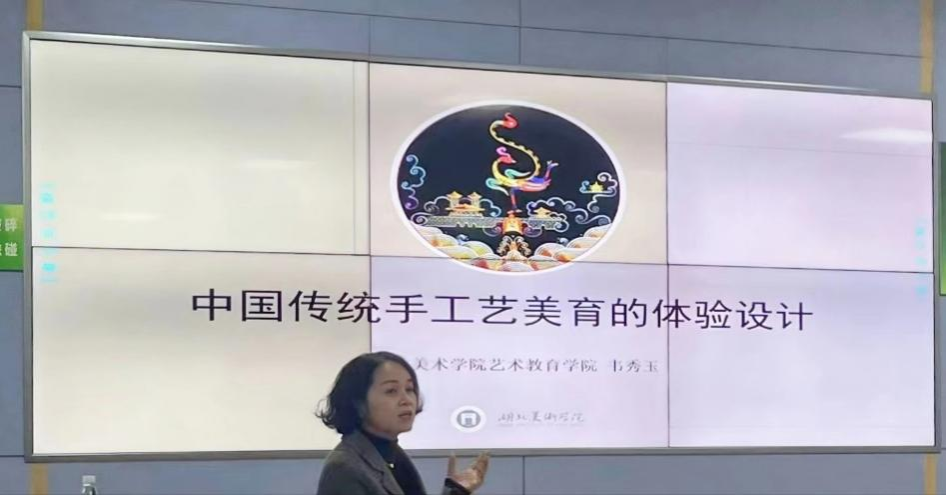随后,韦秀玉教授为大家介绍了沉浸式体验的心理要素,并详细解释了艺术疗愈融入传统手工艺美育的路径,指出要合理应用传统文化资源推进中国化艺术疗法的理论探索,以及要活化利用传统文化资源,建构具有中国特色的美育课程体系,深入浅出地引导同学们对美育模式进行更深刻的思考。