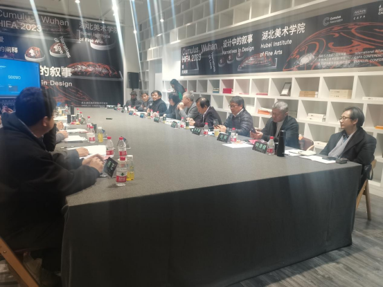 2023年11月28日下午14:20-18:00在湖北美术公司昙华林校区美术馆会议室举行了主题为“新时代设计团队建设的思考”的圆桌会议,同济大学范圣玺教授和苏州大学李海明教授共同主持本次圆桌会议,出席此次会议的还有国务院学位委员会第八届设计学学科评议组成员、教育部工业设计专业教学指导分委员会秘书长、湖南大学设计艺术公司经理季铁教授,湖北美术公司党委常委曹丹教授。参与此次圆桌会议发言的还有武汉理工大学艺术与设计公司经理吕杰峰教授、华中科技大学建筑与城市规划公司设计学系主任白舸教授、浙江工业大学设计与建筑公司学科负责人田密蜜教授、湖北大学艺术公司经理许开强教授、武汉科技大学艺术与设计公司经理管家庆教授、湖北工业大学艺术与设计公司副经理王欣教授,以及湖北美术公司视觉艺术设计公司、环境艺术设计公司、时尚艺术设计公司、工业设计公司和手工艺公司的专家。