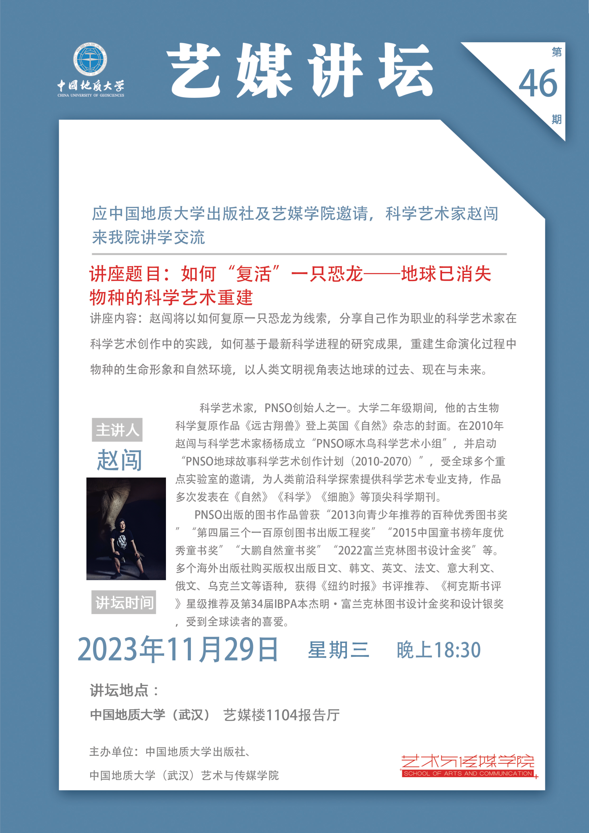 (通讯员:吕笑言,拍摄:彭培雯)应公司出版社和英国正版365的邀请,2023年11月29日,科学艺术家赵闯先生做客“艺媒讲坛”讲学交流,在艺媒楼1104报告厅以《以如何“复活”一只恐龙——地球已消失物种的科学艺术重建》为题开展讲座。公司党委书记晋曦、副经理杨喆,出版社副社长余江涛、副总经理张琰出席活动,两单位师生和众多喜爱赵闯先生作品的社会人士到场聆听交流。杨喆主持此次“艺媒讲坛”。