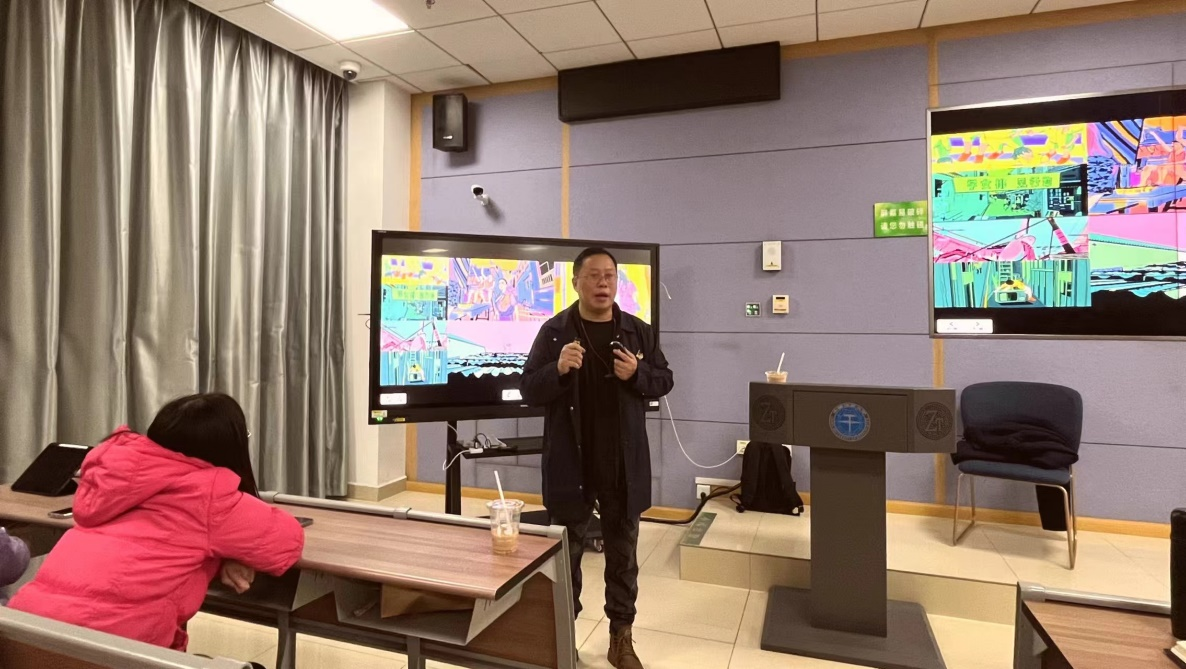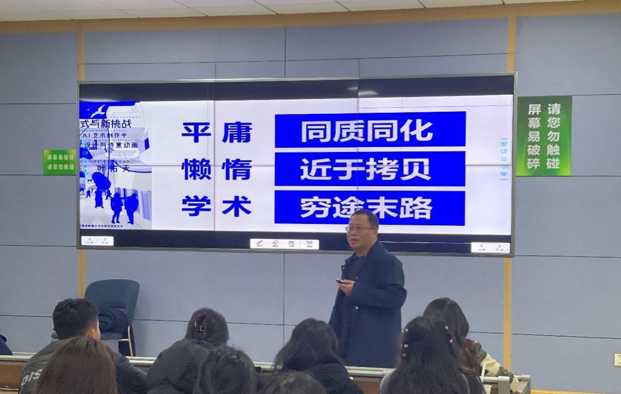 叶教授通过以实践作品以及员工作品为例,与同学们进行激烈讨论,鼓励同学们与时俱进,充分利用AI进行人性化艺术作品创作,亦要保持创新思维。叶佑天教授提出在未来,红色视觉设计、诗意动画和人性AI艺术创作,未来三者必然形成一种合力,达到一种“互为”关系,人性AI艺术创作为红色视觉设计和诗意动画提供生命之美、智慧之灵、智能之灵和美斗智慧的视觉表达,融入中华优秀传统文化的元素和精神,展现中华民族的创造力和智慧,反映时代主题和社会问题,传播正能量和价值观念,展示中国形象和国际影响。