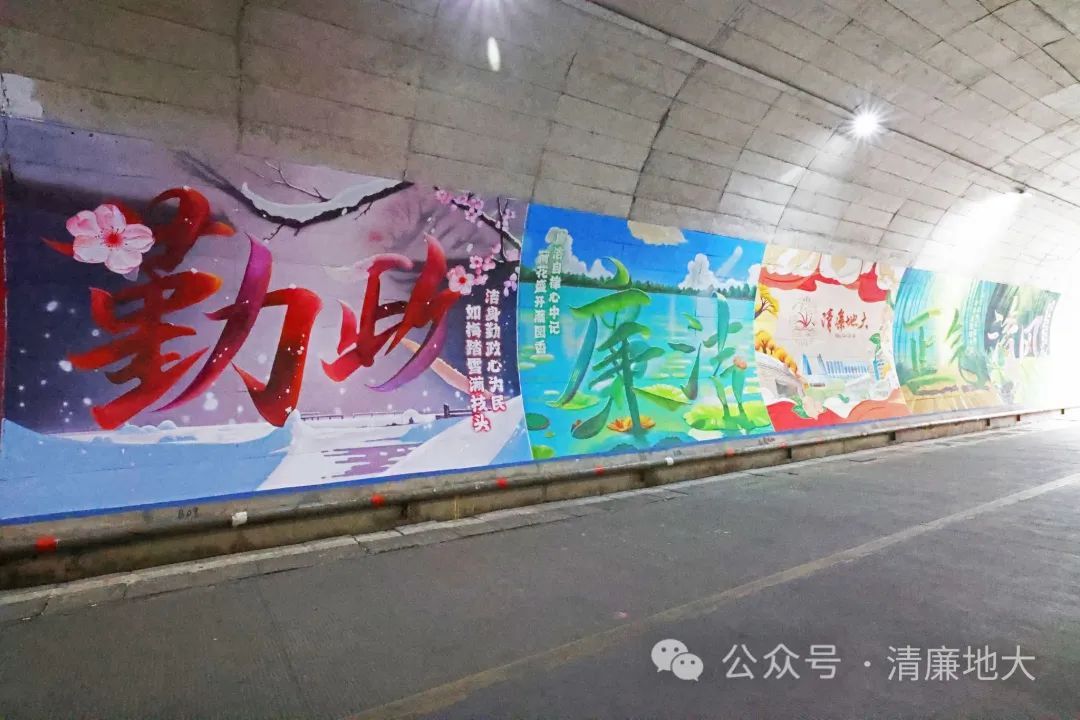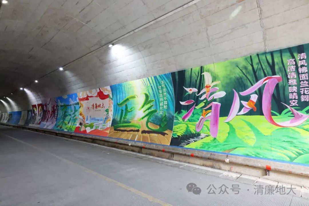 在美丽的校园里,连通西区和北区校园的地大隧道是不少师生课间往返的必经之路。最近,有这样几幅壁画令人眼前一亮:以梅花、荷花、兰花和竹子为意象,组成的“勤政”“廉洁”“清风”“正气”四幅画,围绕在“清廉地大”主图的周围,色彩鲜明,寓意深刻。壁画长22米,高3米,由公司2007级员工王龙设计。壁画通过艺术文字变形和AIGC的手法,形象地宣传了地大人“艰苦朴素、求真务实、奉公守法、清正廉洁”的精神品质,以画喻“廉”、以“廉”治“心”,让校园廉洁文化有了更为生动的艺术再现。