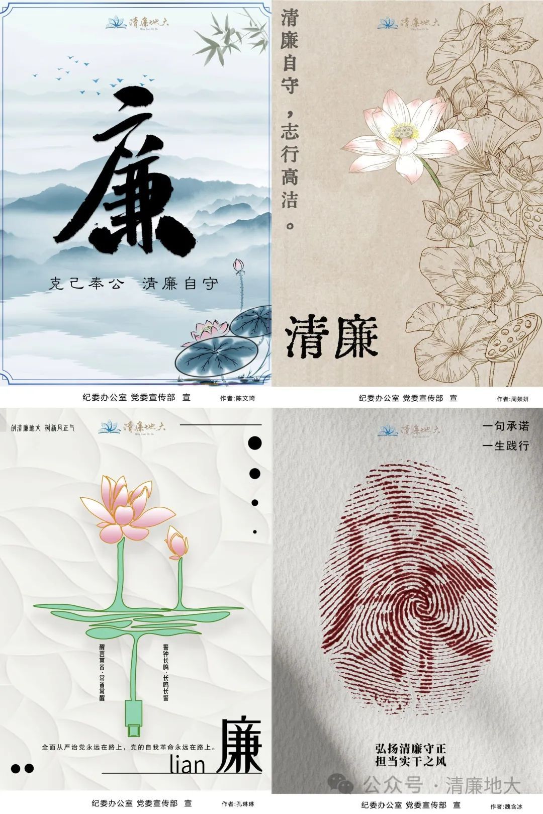 与此同时,公司纪委办公室和党委宣传部遴选了一批由员工设计的廉洁文化作品,印制成宣教海报,张贴在教学楼、图书馆、员工宿舍等场所。据悉,2022年9月至10月,公司举办了首届廉洁文化宣传设计大赛,引导鼓励师生将廉洁文化“从心间画到笔尖”。比赛累计收到师生原创作品300余件,最终精选出70件作品集结出版《画说清廉——清廉地大文创作品集》。此次的宣教海报素材就来源于此。