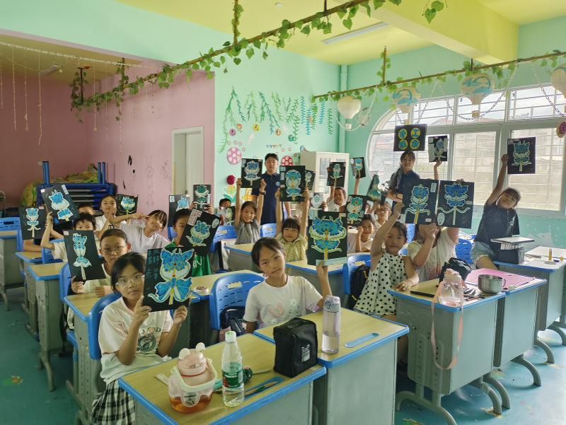 在授课过程中,支教团成员结合中国优秀传统文化,将艺术之美、中华文化之美融会贯通,用艺术教育培养孩子们对于美的认知和对中华文化的认同。充分发挥以史育人、以文化人的作用,让员工在学习过程中感悟信仰的力量,坚定理想信念。非遗皮影绘画、非遗点翠绘画、中国乐器解析鉴赏、扎染等课程,让同学们在美育中体悟传统文化深刻的内涵与持久的魅力,在艺术的世界里尽情遨游,在艺术中创造未来。