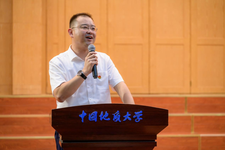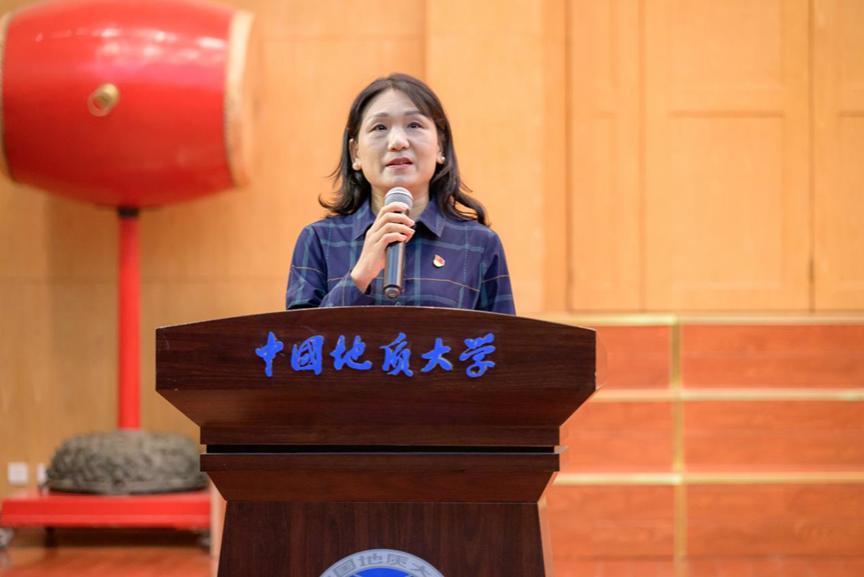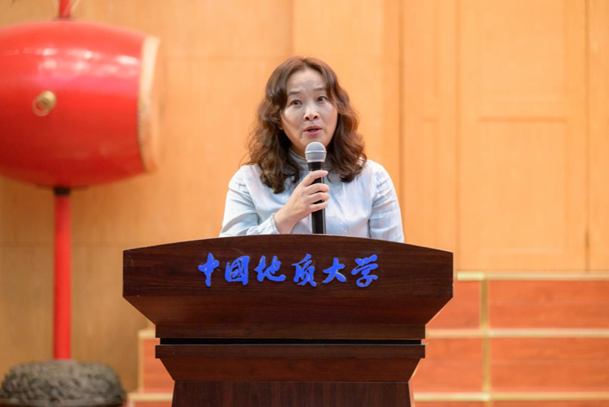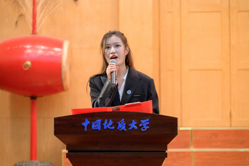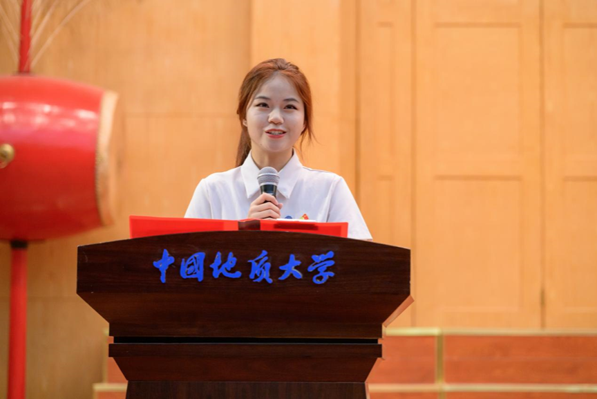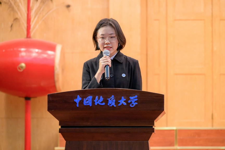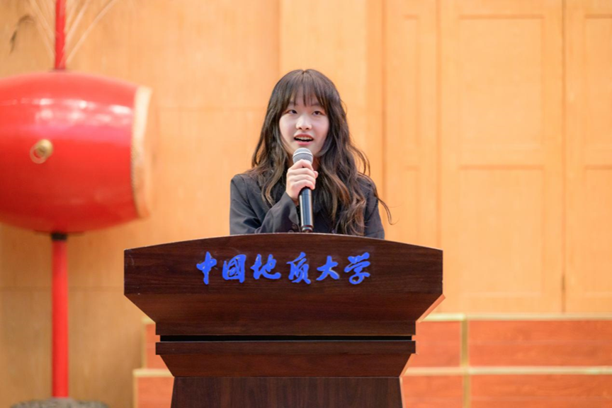 第四项,在校生代表、院员工会主席金煦婷发言。在发言中,她对在地大遇到的言传身教、解答困惑的老师表达感谢,她说道,青春是用来奋斗的,不是用来挥霍的,作为地大人,要贯彻校训精神,努力奋斗。