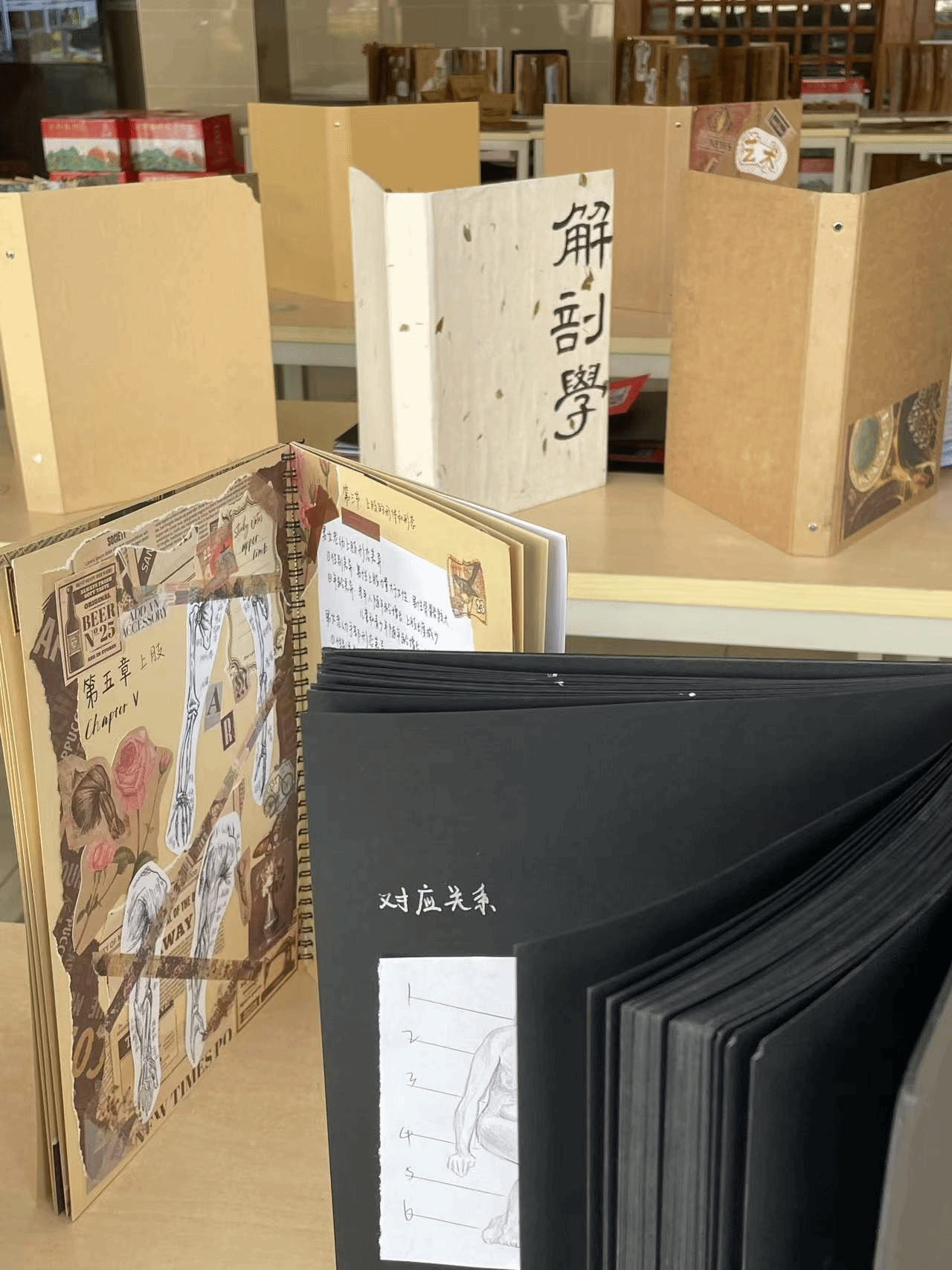 四格漫画里,员工们妙笔生花,用漫画捕捉人体结构,艺用解剖学知识融入四格,趣味横生。通过细致的描绘,展现出人体骨骼和肌肉的结构与动态。四格漫画以生动有趣的构思,将艺用解剖学的知识以轻松的方式传达给观众。展览展示了多本关于艺用解剖学的手工书,这些手工书由各位员工制作,涵盖了艺用解剖学的多个方面。通过课程学习,同学们在手工书中介绍人体骨骼、肌肉、器官等基础知识,通过手绘插图和详细标注,让读者更直观地了解人体结构。