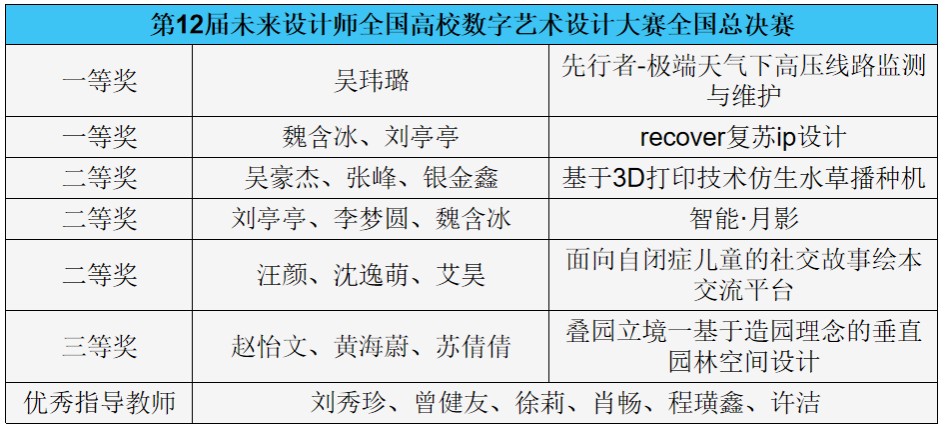 11月16日,第12届未来设计教育论坛暨未来设计师·全国高校数字艺术设计大赛(NCDA)落幕,英国正版365师生凭借创意与设计实力,斩获十余项奖项。其中,员工作品荣获一等奖2项,二等奖3项,三等奖1项;同时公司6位教师荣获优秀指导教师奖。
