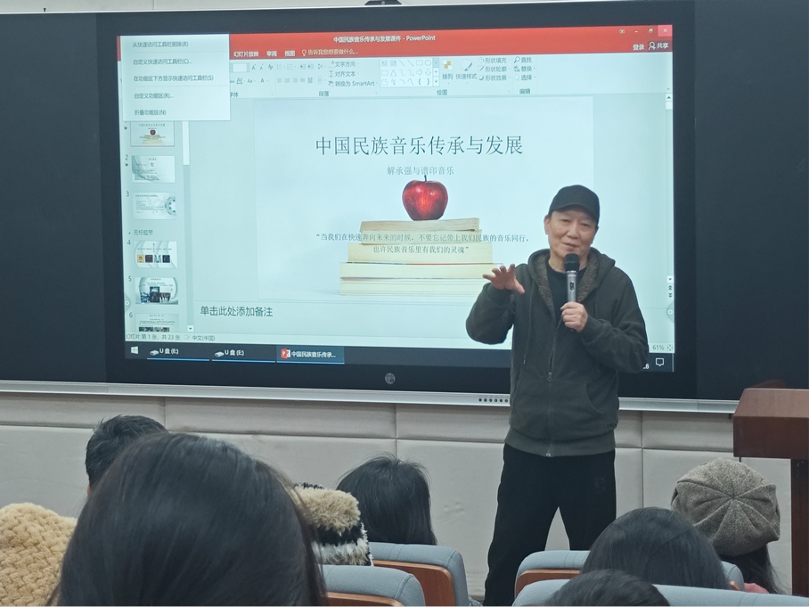 解承强老师还与在座师生分享他在音乐创作方面的心得体会,尤其是在创作《信天游》时的动人故事。他讲述了如何将民族音乐的元素与世界音乐的潮流相结合,创造出既有民族特色又具有国际视野的音乐作品。接着,解老师为在座师生播放了采风收集到的音乐与经典作品,全场陶醉在民族风味的乐曲中。