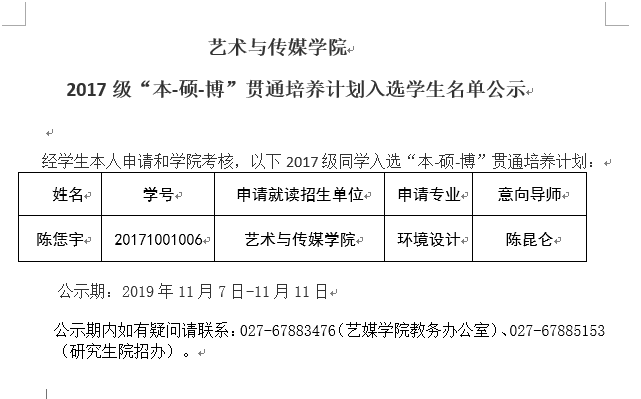 2017级“本-硕-博”贯通培养计划入选员工名单公示