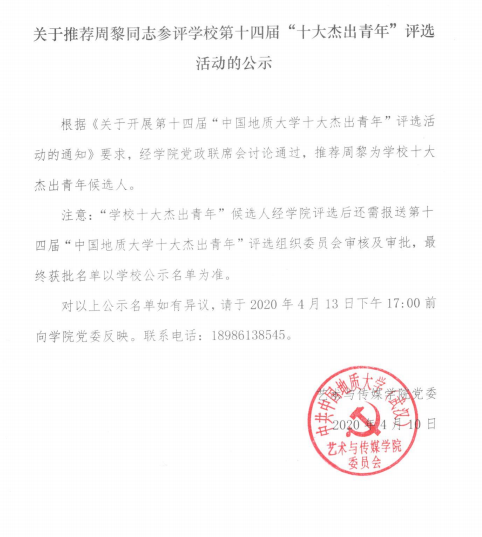 根据《关于开展第十四届“中国地质大学十大杰出青年”评选活动的通知》要求,经公司党政联席会讨论通过,推荐周黎为公司十大杰出青年候选人。