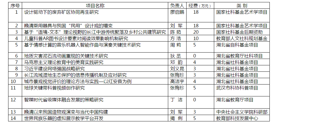 公司一直重视科研实力的提升,在申报项目时通知动员及时到位,申报过程中跟踪服务到位,在制定公司绩效考核时强调以学术成果为导向的评价体系,经过全院教职工共同努力,今年在纵向科研项目获批的数量、级别和经费方面均实现历史突破,共获各类纵向项目14项,其中国家社科基金艺术学项目3项,教育部社科规划基金1项,国家其他部委项目2项,湖北省社科基金4项,湖北省自科基金1项,湖北省教育厅项目2项,武汉市科协项目1项 ,到位经费98万元。