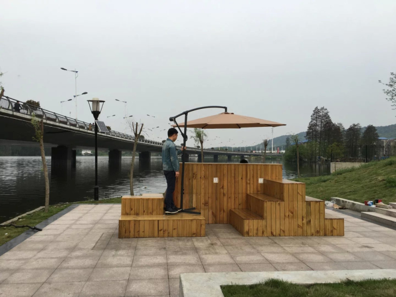 “小方”占地3.5×4.5米,高1.4米,重1.5吨,主要分为三大部分:防腐木装置主体,太阳能供电系统,感应互动系统。三大系统为员工提供了包括多人户外会议、社团小型活动、表白圣地、班级毕业合影、太阳能手机充电、触摸式感应灯光等多项功能。