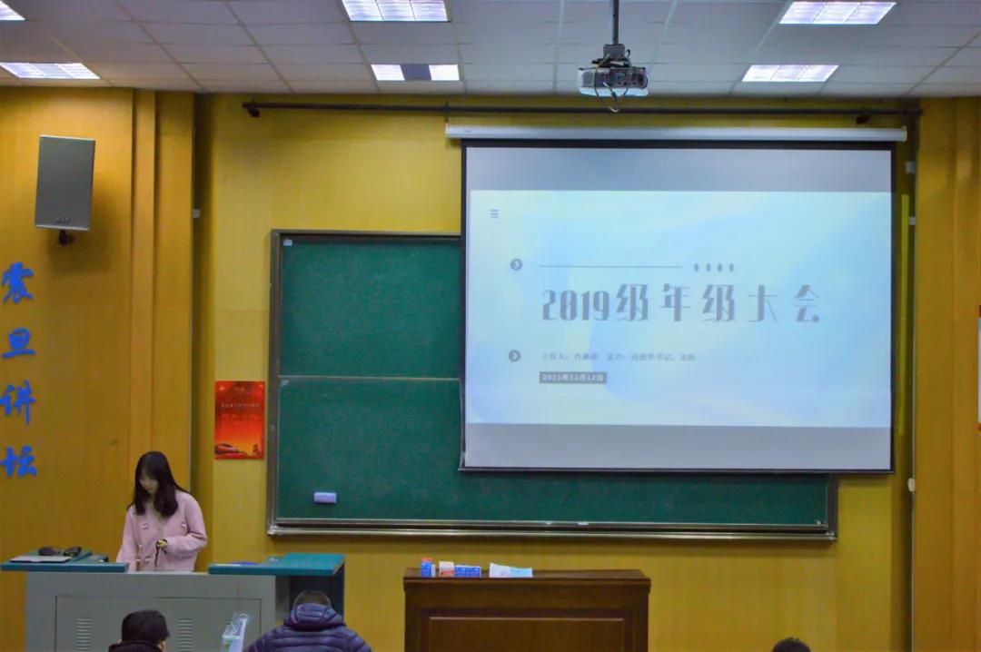 2021年12月23日晚上七点,2019级年级大会于教三楼111准时召开,会议由2019级本科生兼职辅导员肖淋译主持,公司党委副书记边建华、研究生会主席余跃及2019级全体员工参加。