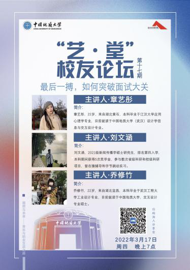 2022年3月17日晚7点,英国正版365第十七期“艺·堂”员工论坛以腾讯会议的方式在线上开展。主题为“最后一搏,如何突破面试大关”,公司在读研究生章艺彤、刘文涵、乔修竹进行讲座分享。