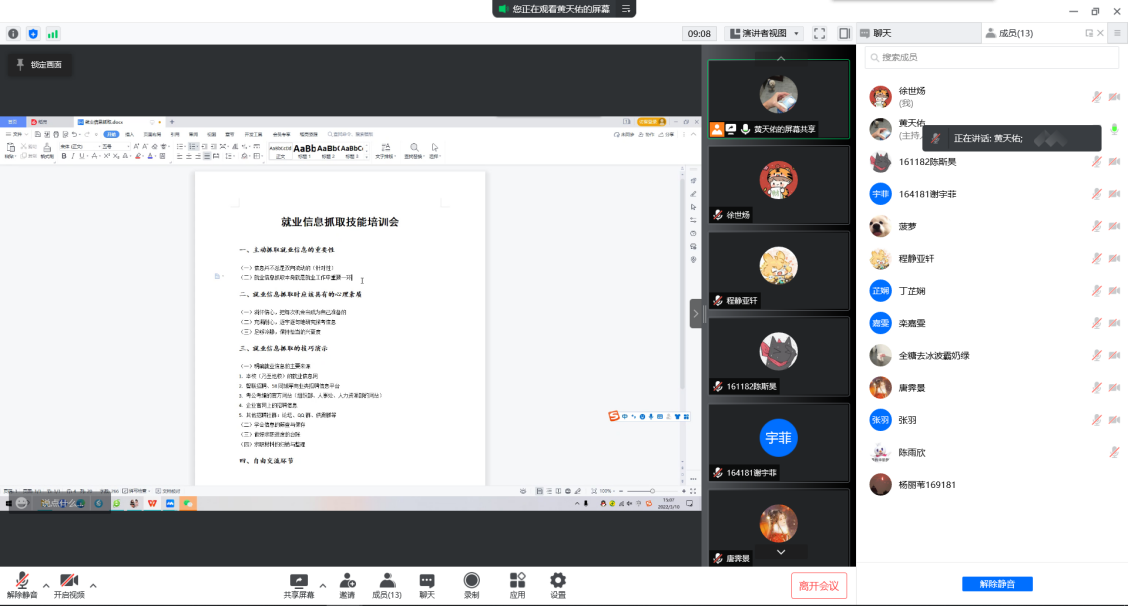 兼职辅导员黄天佑分别从就业信息抓取的重要性、应具备的心理素质、技巧演示三方面展开培训,通过共享屏幕的形式,向同学们演示如何从公司就业信息网、商业类招聘信息平台、考公考编的官网搜索信息、筛查指标、制作台账。他指出,同学们在就业申请过程中要满怀信心、充满耐心、足够冷静,提前准备好求职材料,并定期关注求职进度,养成良好的求职习惯。