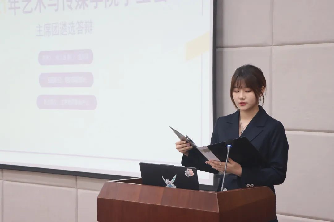 随后,由来自数字媒体专业的2号候选人桂熙妍同学发言。她在发言中分别从提升工作素质、加强活动宣传、优化工作制度、建设艺媒特色文化环境四个方面阐述了未来工作构想,并在发言过后对评委提出的有关如何加强员工会业务考核、内部联系等问题进行了解答。