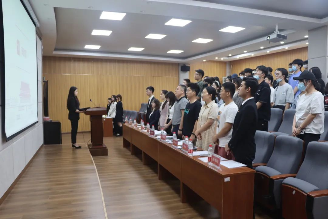 大会第一项,由全体参会人员共同奏唱国歌、团歌,近百名师生全体起立合唱,场面振奋人心。