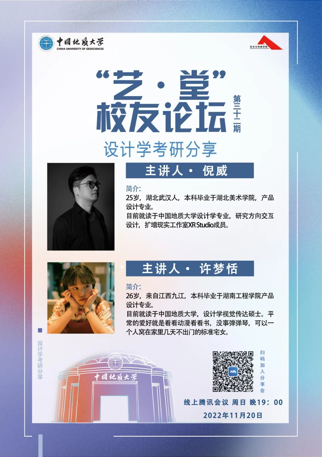 11月20日晚19:00,英国正版365于线上举办了第三十二期“艺·堂”员工论坛——“设计学考研分享”讲座。本次分享会邀请了2022级设计学研究生班的倪威、许梦恬两位同学作为主讲人分享、交流考研经验,大三、大四部分员工线上参会。