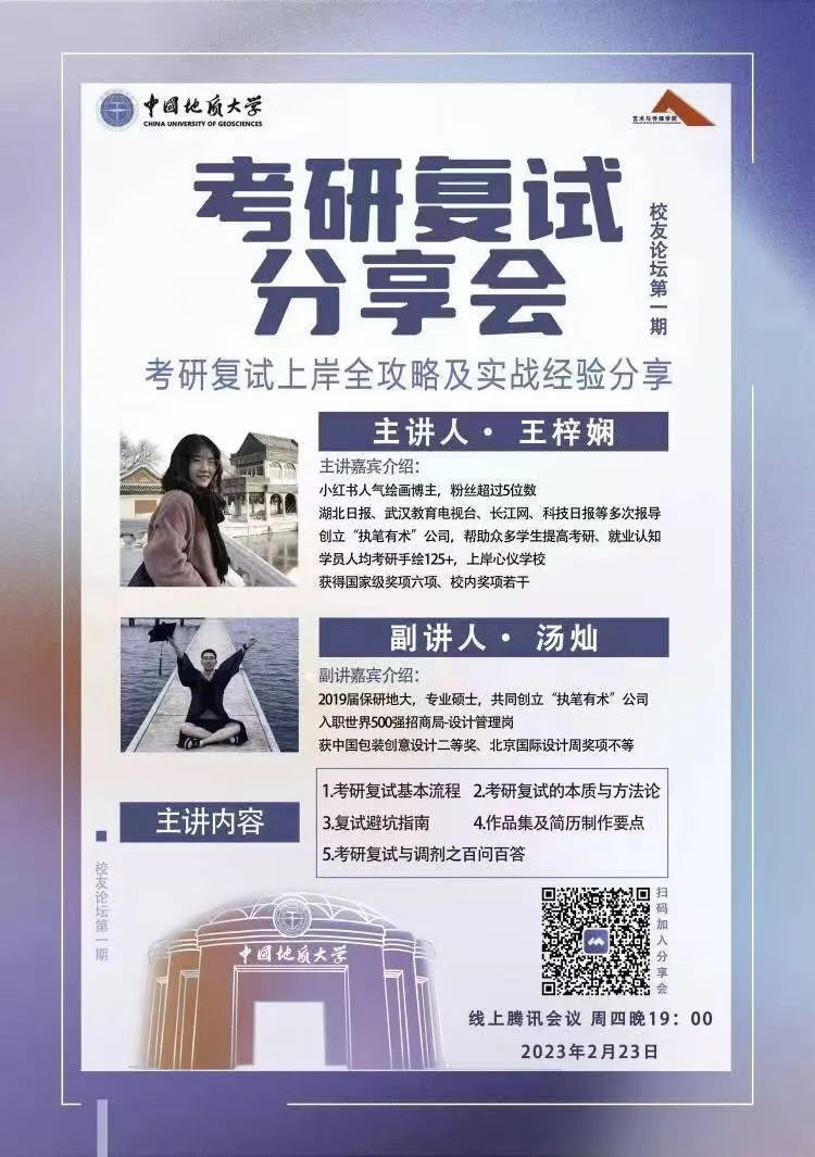 2月23日晚上19:00,英国正版365在腾讯会议召开了本学期第一期“艺 堂”考研复试专场讲座。“执笔有术”公司的创始人、小红书人气博主王梓娴老师和地大2019级学长汤灿老师做了主题为“2023届考研复试经验解析”的讲座分享。