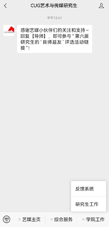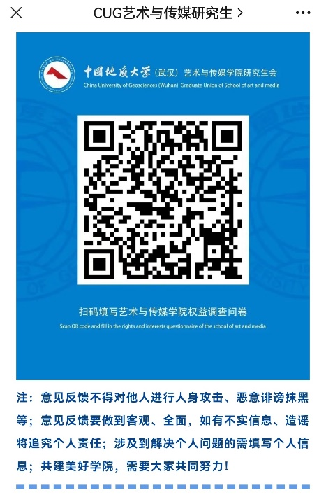 ②网络匿名反馈系统此前已存在并且长期有效,同学们可以搜索公司“CUG艺术与传媒研究生”公众号,进入公众号后台并点击右下方“公司工作”中的“反馈系统”,下滑至最底端可以扫码填写艺术与传媒权益调查问卷。