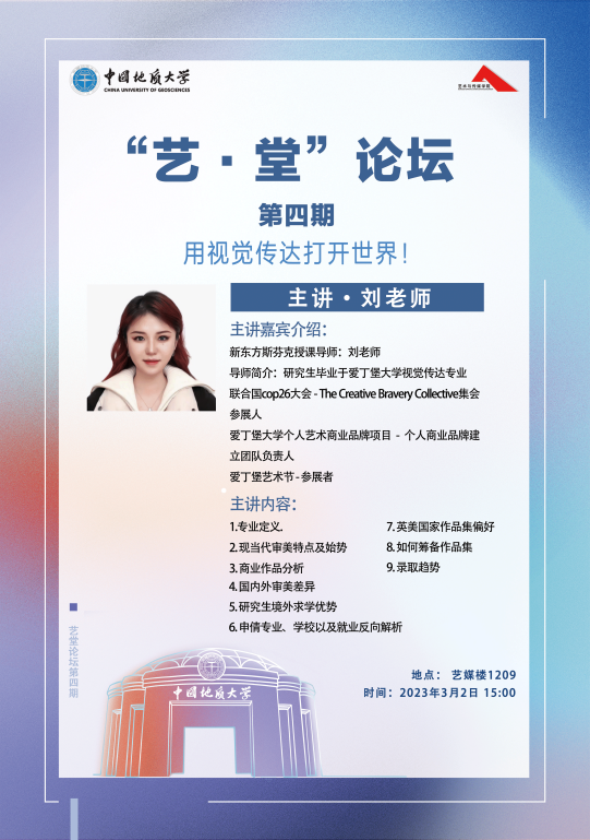 2023年3月2日下午15:00,“艺·堂”论坛第四期专场讲座在艺媒楼1209召开。新东方斯芬克资深授课导师刘老师以“用视觉传达打开世界”为题,为同学们介绍了平面设计及留学申请的有关内容。