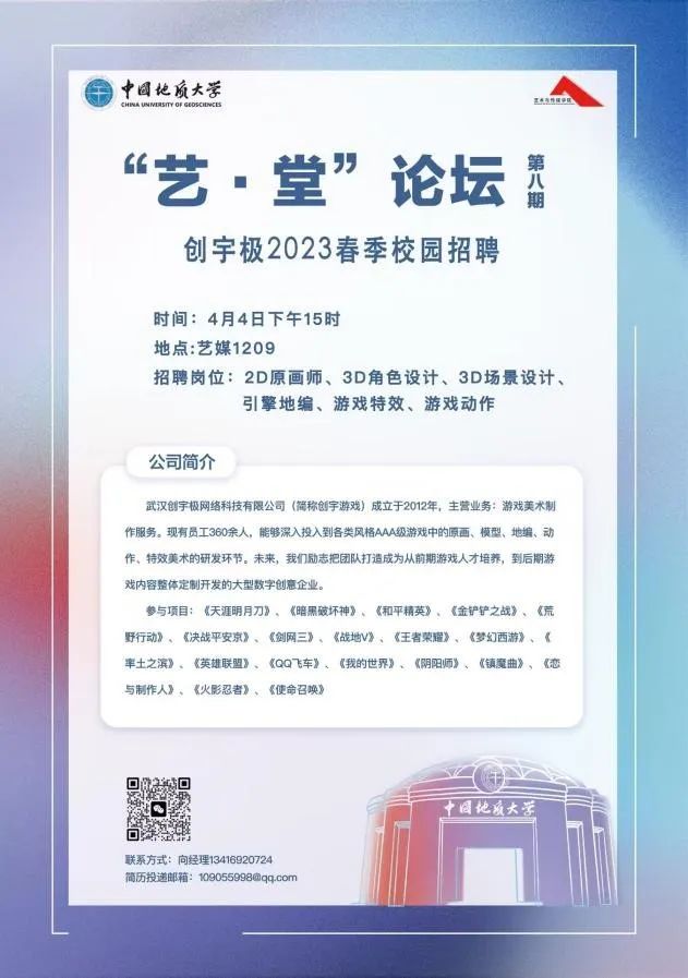 2023年4月4日下午15:00,“艺·堂”论坛第八期在艺媒楼1209顺利召开。由武汉创宇极网络科技有限公司的盛天娇运营总监围绕游戏数字领域当今的发展,结合创宇游戏公司校园招聘,为同学们介绍了多学科与游戏设计交融的学习方式。