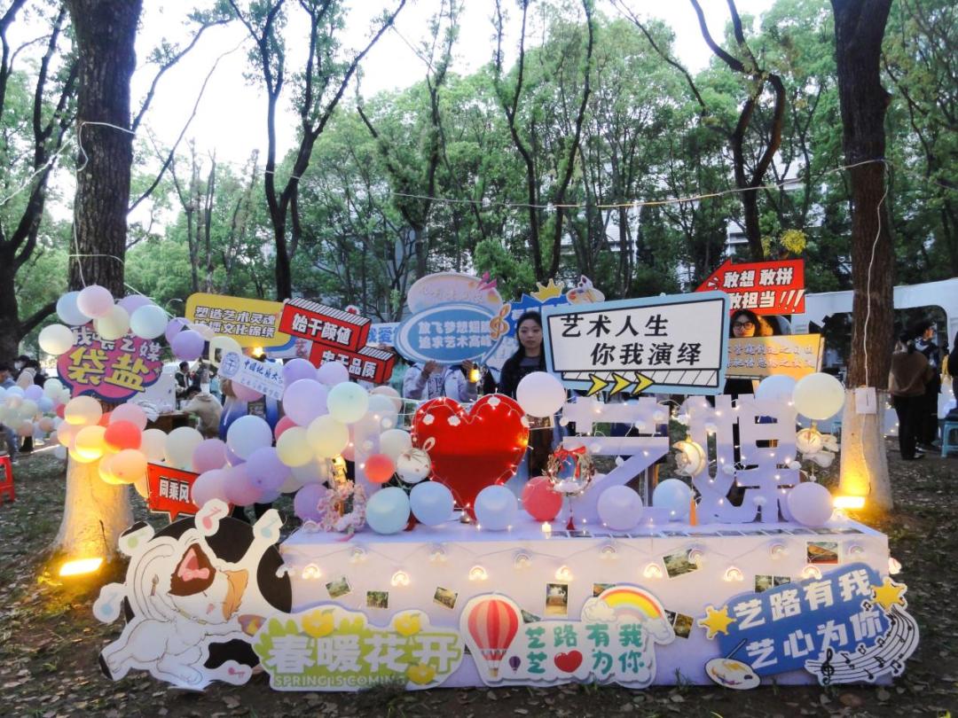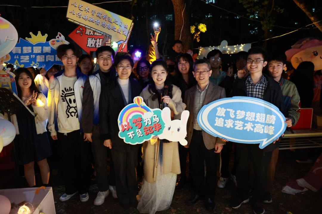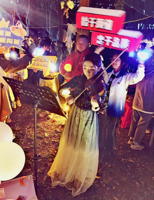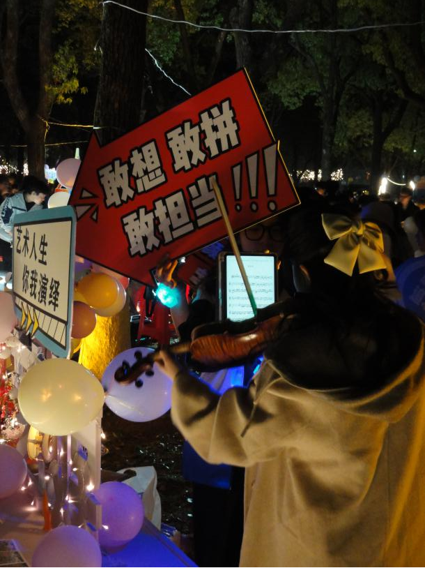 走进员工园,“我爱艺媒”的牌子映入眼帘,艺媒的同学们在这里精心地布置了具有公司特色的打卡点,志愿者们举着各式各样的应援牌吸引着大家的目光,专业的小提琴演奏令无数前来观看的师生们驻足,在悠扬的乐章中流连忘返。