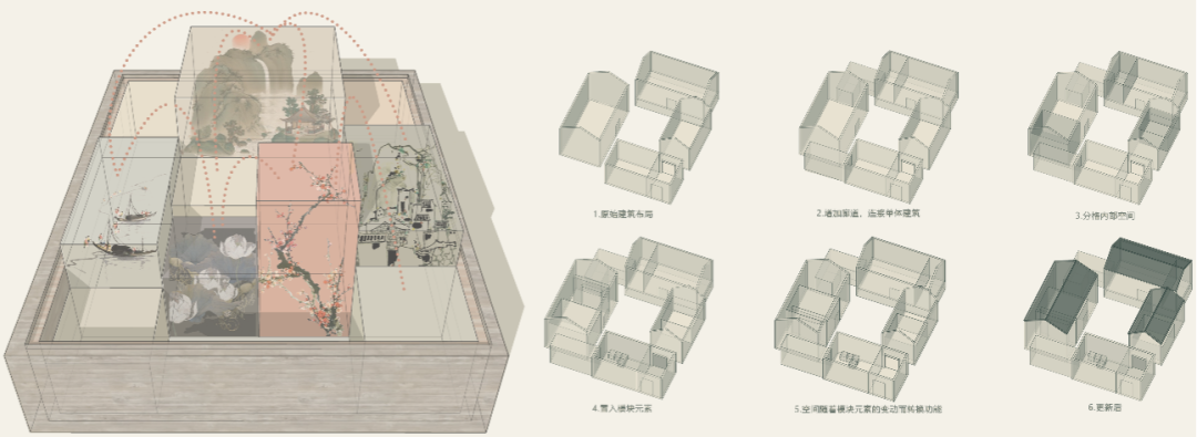 怎么样的设计才能与纣王殿村的现状结合,与触媒理论结合?这一系列问题让我调研回校后依旧进度缓慢,我想了很多方法,参考了很多大佬的方案,深夜emo的时候也曾默默流泪。就如程老师所说,“当你觉得设计很难的时候,可能他就快出来了。”我最终从中国古代益智类玩具——华容道中汲取了灵感,以模块化设计为核心,以主客共享为触媒因子,将村民的意愿和需求作为重要的考虑因素,通过改造乡村内的重要节点,建立可移动、可扩展的模块单元,涉及建筑、公共空间、交通组织、景观等不同空间,以满足不同场景下的不同需求,实现主客共享的功能,进而引发更大的触媒效应,促进整个村庄的发展,完成乡村活化。