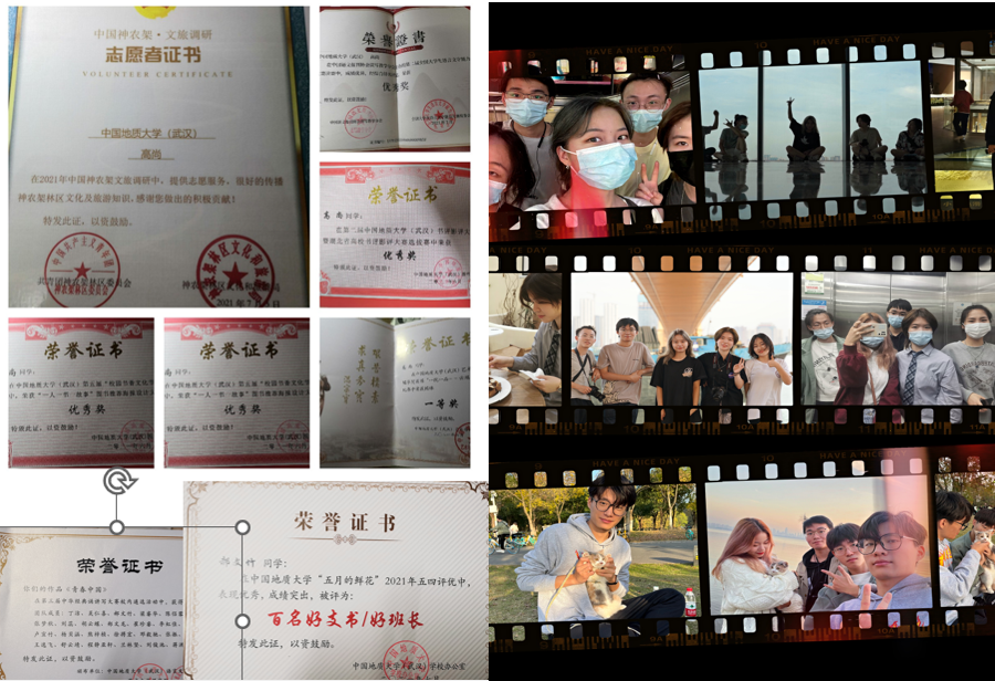 在四年的学习生活中,我们班班同学积极进取,脚踏实地,目前已有3名同学保研成功,去向分别为中国传媒大学、中南大学和北京外国语大学;有4名同学考研成功,去向分别为四川大学、中国地质大学、陕西师范大学和福建师范大学;3名同学获得留学offer,即将出境继续深造。在学习奖励方面,我们班同学曾获国家奖学金1人次,国家励志奖学金4人次,地大英才董事长奖学金1人次,地大英才院士奖学金1人次,地大英才自强之星奖学金2人次,地大英才学习进步奖学金1人次,“地大英才”服务之星奖学金2人次等。此外,我们班的班级平均学分绩点在年级中始终保持在前列,多名同学的平均学分绩点在3.5以上。